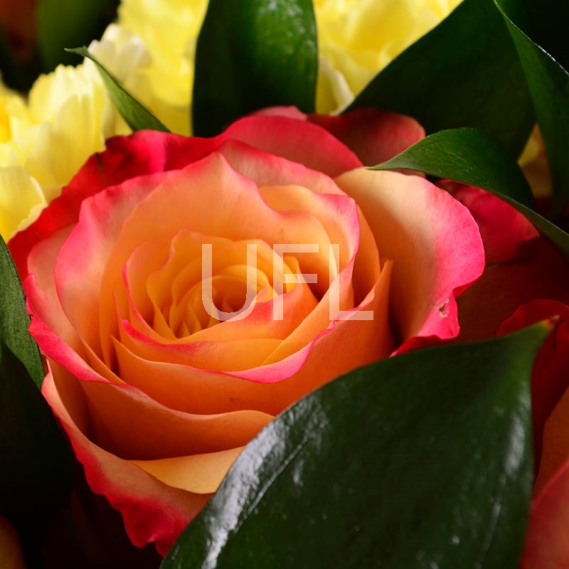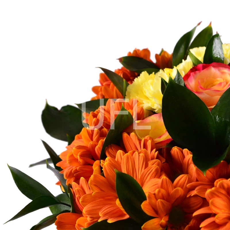 • Состав: Гвоздика жёлтая (5 шт.) · Хризантема оранжевая (3 шт.) · Гербера жёлтая (4 шт.) · Роза коралловая до 60 см пигги (3 шт.) · Зелень в букет · Лента на цветы · Упаковка 2 м