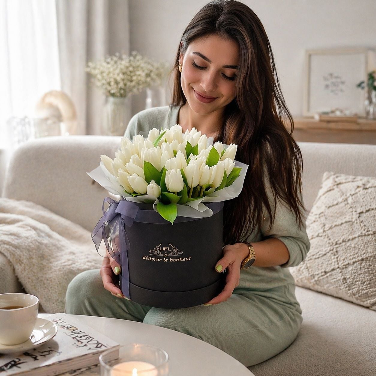 В Берлине Белые тюльпаны в коробке 45шт часто выбирают для поздравлений, романтических моментов и праздников. Такой букет часто выбирают для важного события.