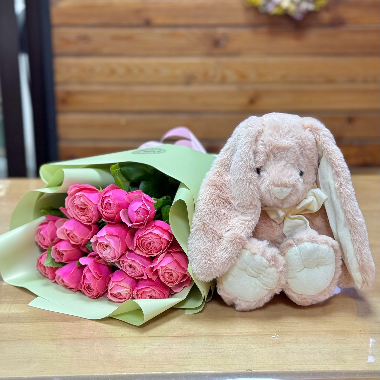 Купить Розовые розы и зайка с доставкой по Борнмуту