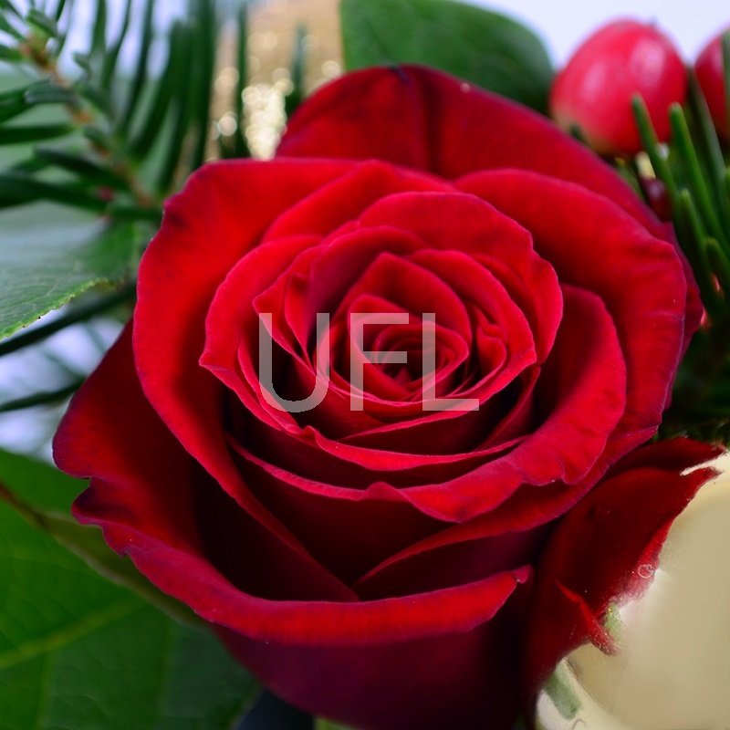 • Состав: Конфеты Ferrero Rocher 200 г · Новогодний декор · Роза красная до 50 см (2 шт.) · Новогодние шарики (2 шт.) · Гиперикум красный · Ель · Мини деко