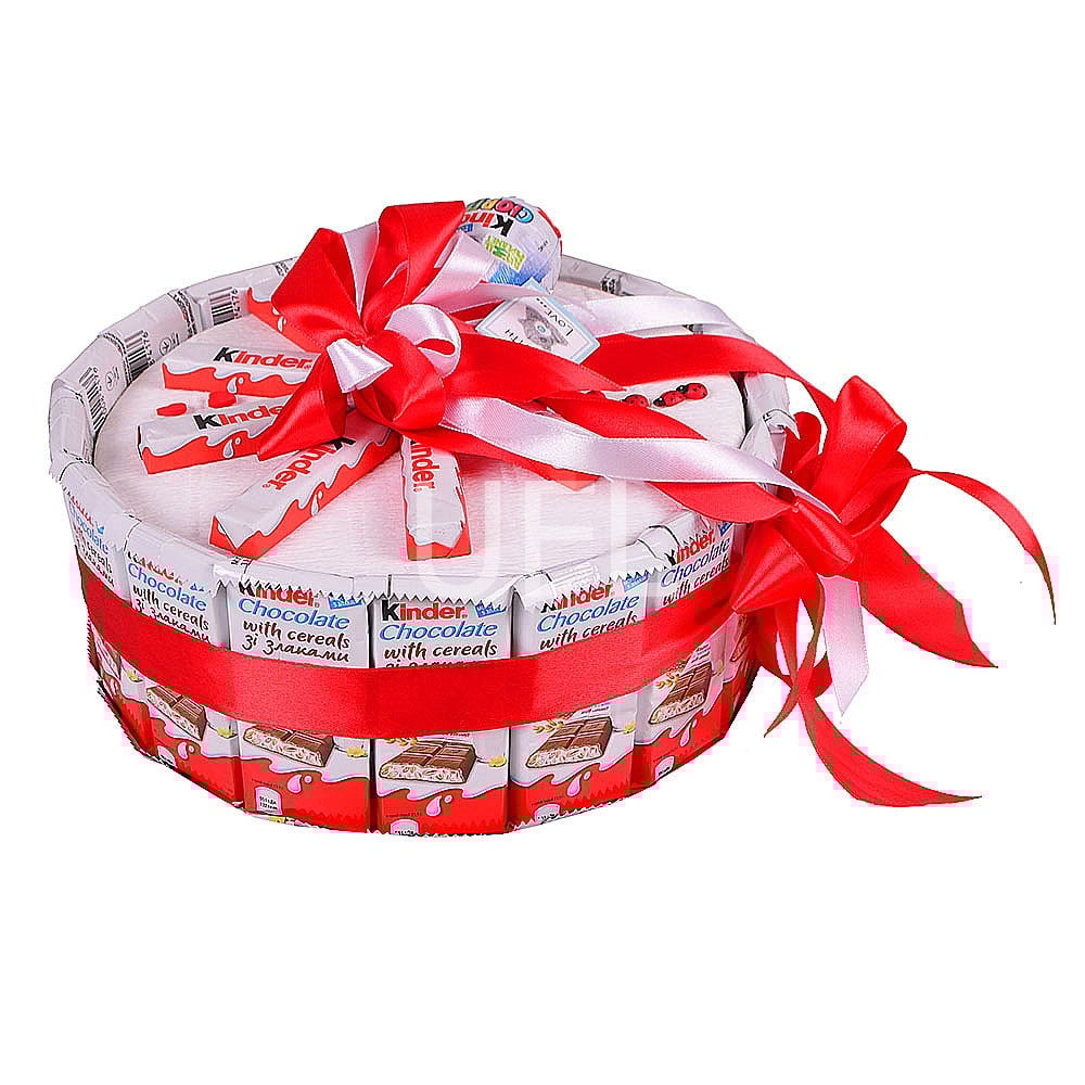 • Состав: Яйцо Kinder сюрприз · Kinder chocolate 100 г · Шоколад молочный Kinder Chocolate со злаками (17 шт.) · Лента на цветы (2 шт.) · Декоративные элементы в букеты цветов