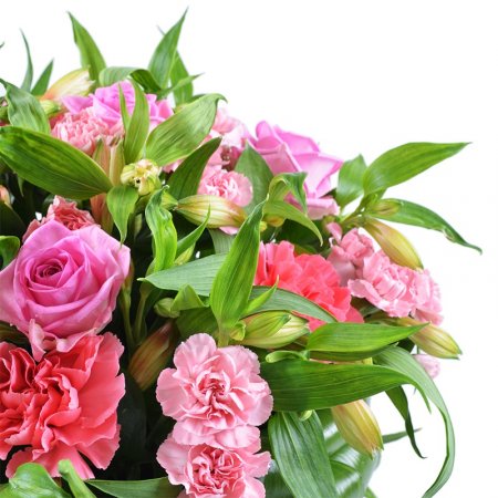• Consist: Box M · Oasis · Rose pink up to 60 sm (5 pc) · Alstroemeria pink (8 pc) · Carnation pink (8 pc) · Greens