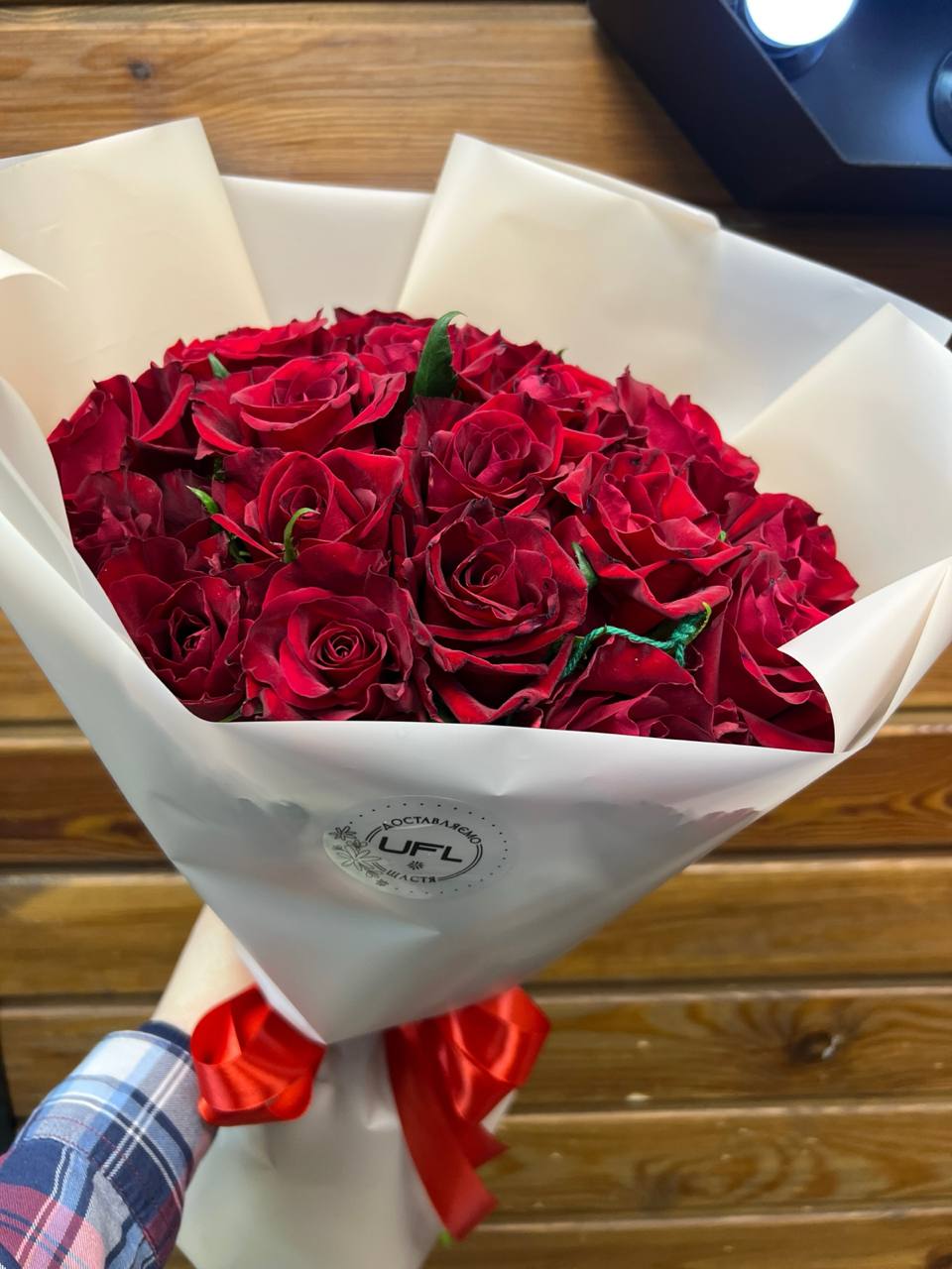 Order 25 red roses bouquet in Atyusha — it means giving emotions and a good mood. This bouquet is often chosen for a birthday.