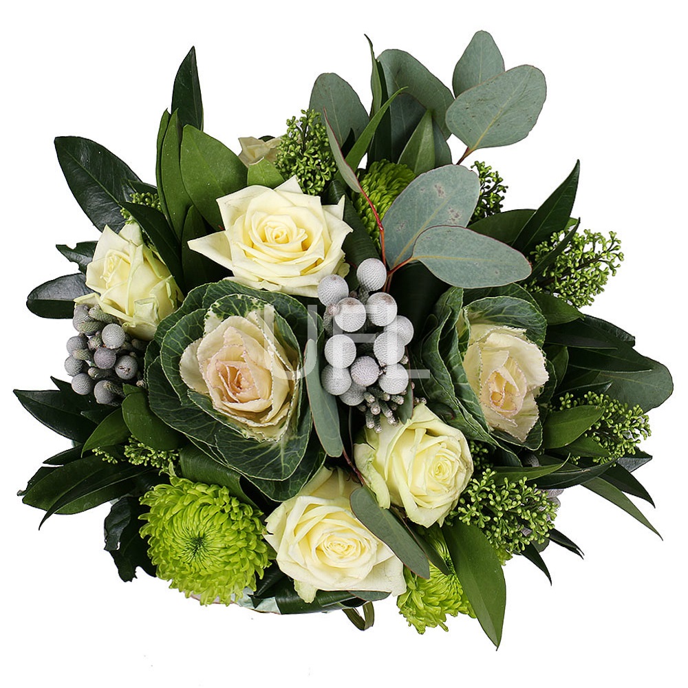 • Consist: Roses white local up to 60cm (5 pc) · Chrysanthemum green single-head (3 pc) · Brunia (3 pc) · Greens · Eucalyptus · Packing for a flower bouquet · Tape for flowers · Skimmia (3 pc) · Brassica white (2 pc)