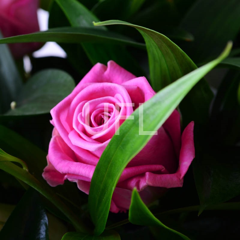 • Consist: Lily white (6 pc) · Rose pink up to 60 sm (9 pc) · Eustoma white (5 pc) · Eustoma pink (5 pc) · Packing for a flower bouquet · Tape for flowers
