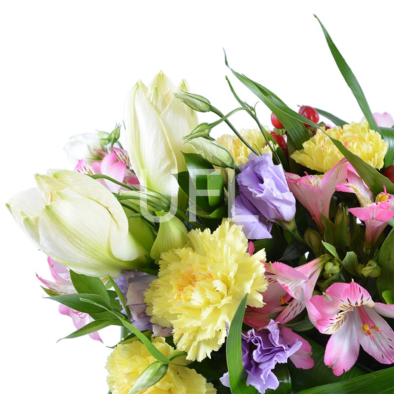 • Consist: Anthurium green, Anthurium Marysia (3 pc) · Alstroemeria pink (5 pc) · Amaryllis · Carnation yellow (3 pc) · Eustoma violet (2 pc) · Eustoma white (3 pc) · Greens · Vase