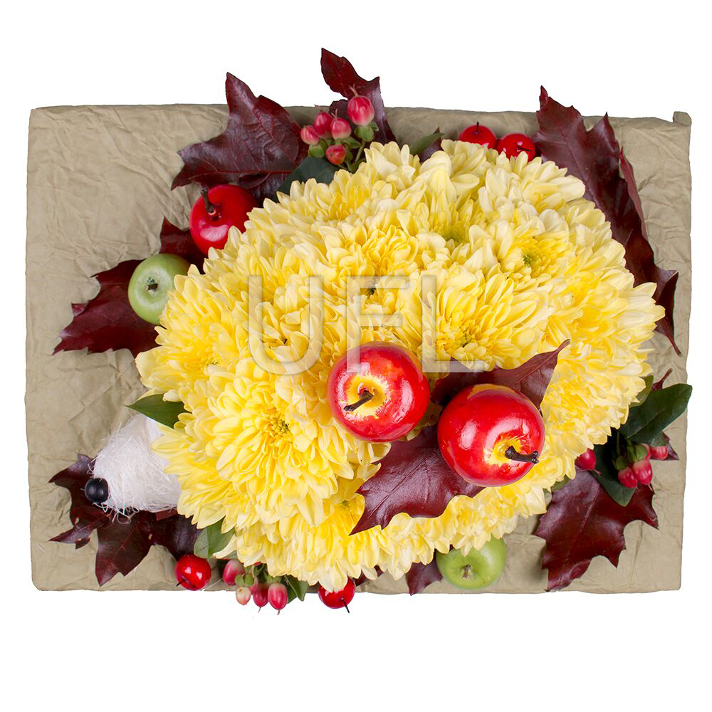 • Consist: Сhrysanthemum yellow (25 pc) · Decorative elements (3 pc) · Oasis (5 pc) · Greens · Hypericum red (3 pc) · Autumn leaves (3 pc) · Apple decorative (10 pc)