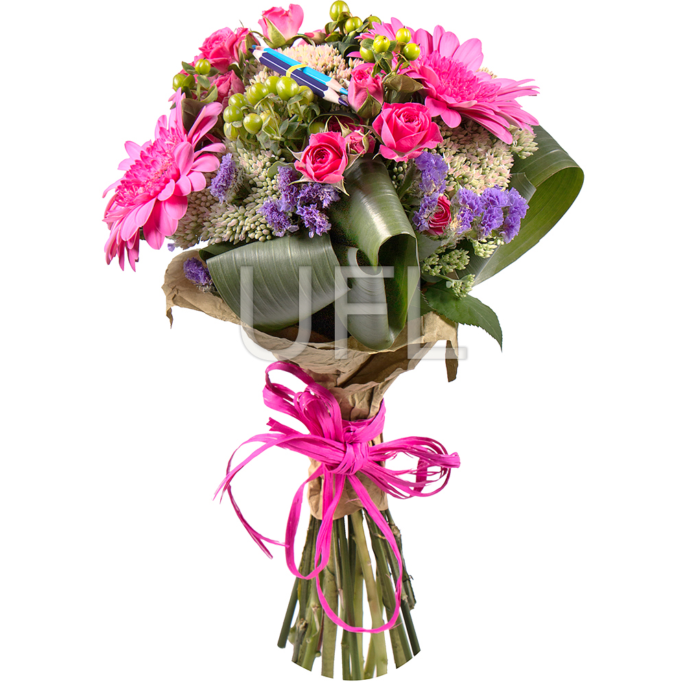 • Consist: Gerbera pink (3 pc) · Hypericum green · Roses spray pink (2 pc) · Statice blue · Packing for a flower bouquet · Tape for flowers · Sedum (4 pc) · Pencil (4 pc)
