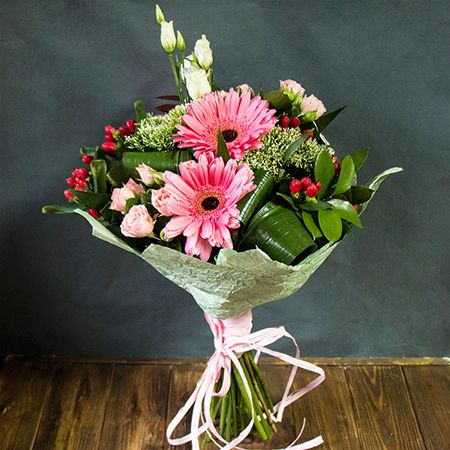 • Consist: Gerbera pink (3 pc) · Hypericum red (2 pc) · Roses spray pink (4 pc) · Eustoma white · Trahelium green (3 pc) · Greens · Packing for a flower bouquet · Tape for flowers