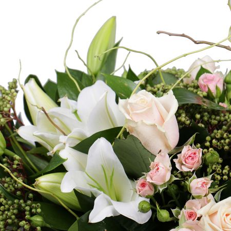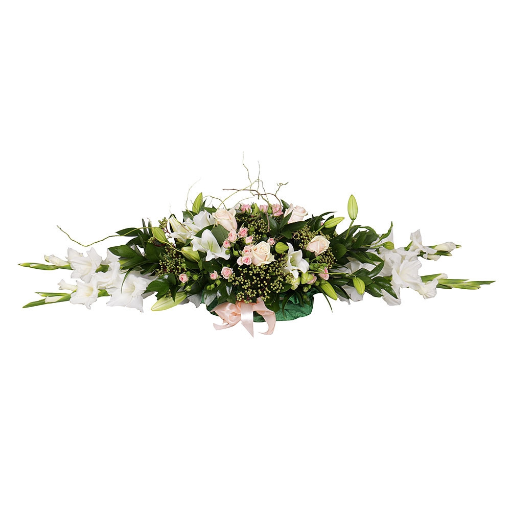 • Consist: Gladiolus (4 pc) · Roses spray pink (3 pc) · Lily white (4 pc) · Rose cream 50 cm (5 pc) · Greens (3 pc) · Ruskus (20 pc) · Decorative branches (2 pc) · Tape for flowers · Oasis · Skimmia (3 pc)