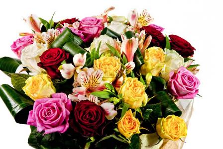 • Consist: Roses mix up to 60cm (21 pc) · Packing for a flower bouquet · Alstroemeria varicolored (5 pc) · Tape for flowers · Greens