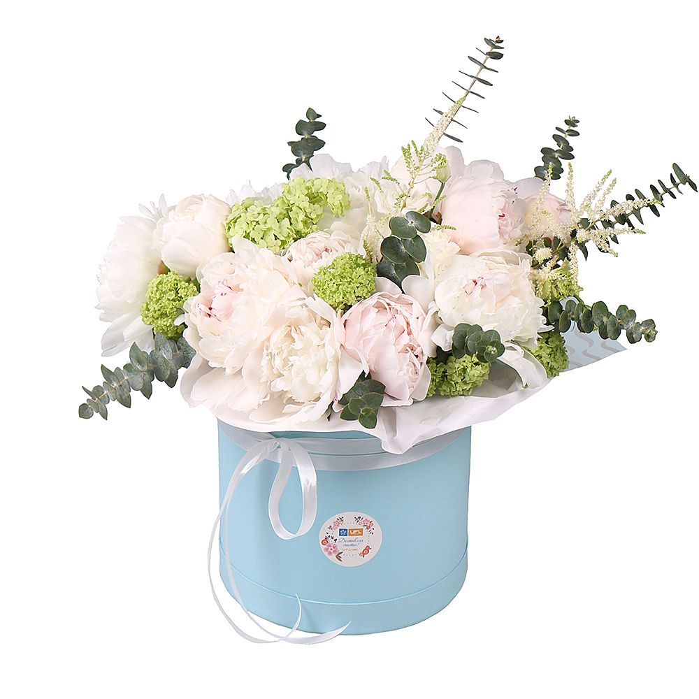 • Consist: Астильба (2 pc) · Eucalyptus (2 pc) · Viburnum (3 pc) · Tape for flowers · Round box S 13x14 cm · Peony white (13 pc)