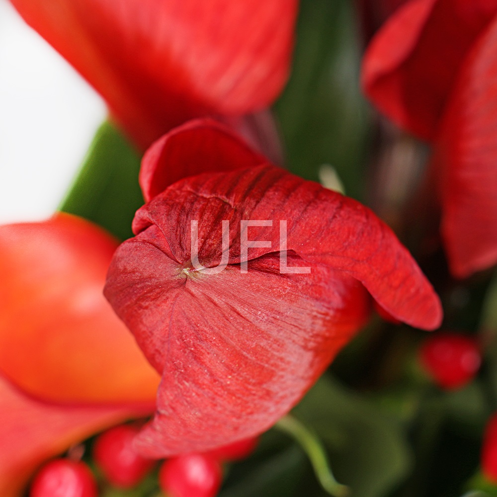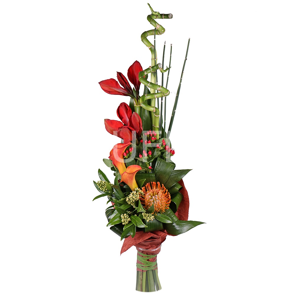 • Consist: Amaryllis red (2 pc) · Calla orange (2 pc) · Leucospermum · Hypericum red (2 pc) · Skimmia (3 pc) · Bamboo (2 pc) · Aspidistra (5 pc) · Tape for flowers