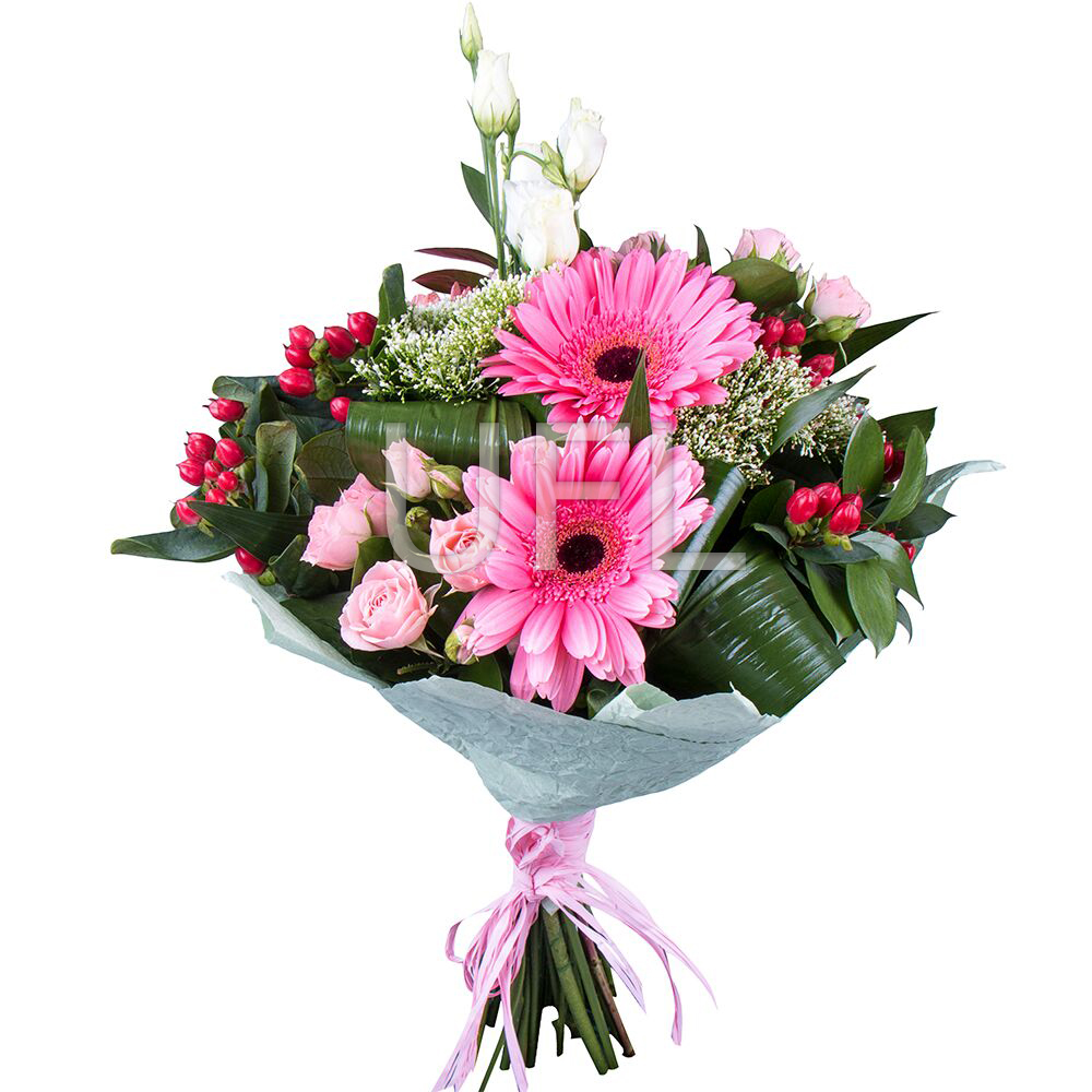 • Consist: Gerbera pink (3 pc) · Hypericum red (2 pc) · Roses spray pink (4 pc) · Eustoma white · Trahelium green (3 pc) · Greens · Packing for a flower bouquet · Tape for flowers