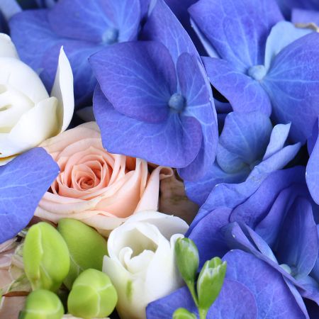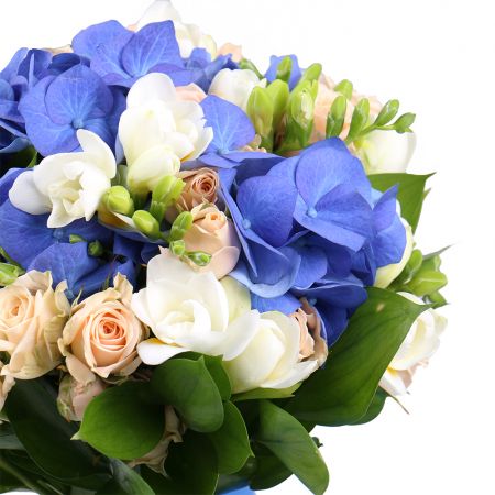 • Consist: Hydrangea blue · Rose spray cream (10 pc) · Freesia white (7 pc) · Greens · Tape for flowers