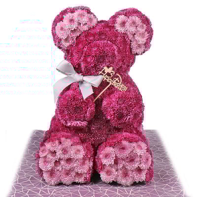 Order Pink teddy with a tie-bow in Estee — it means giving emotions and a good mood. This bouquet is often chosen for a holiday.