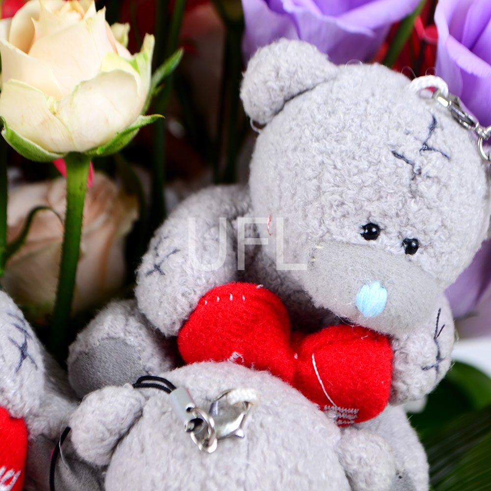 • Consist: Gerbera pink (3 pc) · Rose spray cream (2 pc) · Eustoma violet · Beargrass · Toy Teddy bear 5-10 cm (3 pc) · Butterflies decorative · Greens · Chrysanthemum spray white
