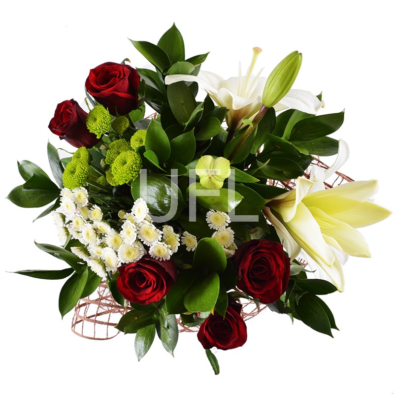 • Consist: Lily white · Сhrysanthemum green · Сhrysanthemum white (2 pc) · Greens · Packing for a flower bouquet · Tape for flowers · Roses red up to 50 cm (5 pc)