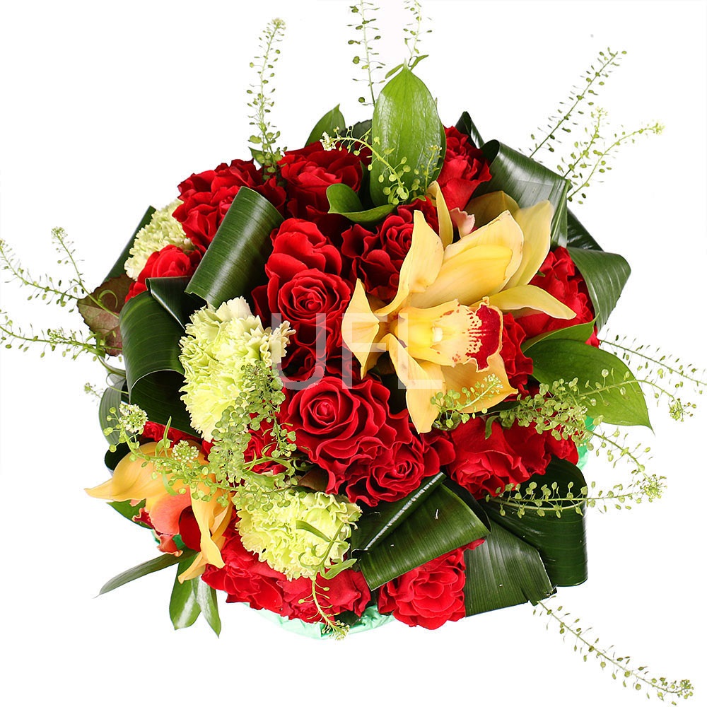 • Consist: Packing for a flower bouquet · Tape for flowers · Greens · Rose red up to 50 cm (13 pc) · tlaspi · Carnation green (3 pc) · Yellow orchid (3 pc)