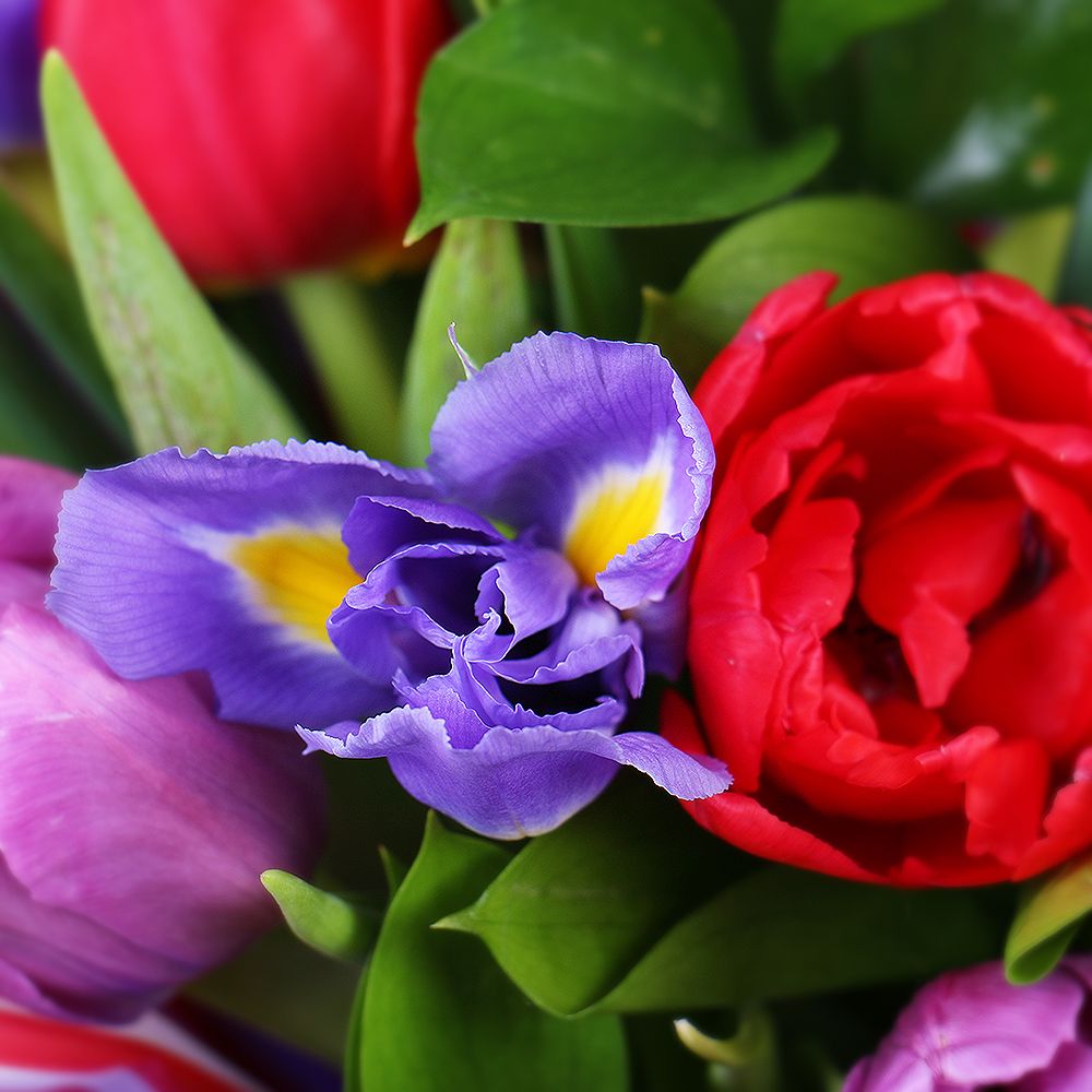 • Consist: Tulip red (5 pc) · Iris blue (5 pc) · Tape for flowers · Ruskus (5 pc) · Tulip yellow (5 pc)