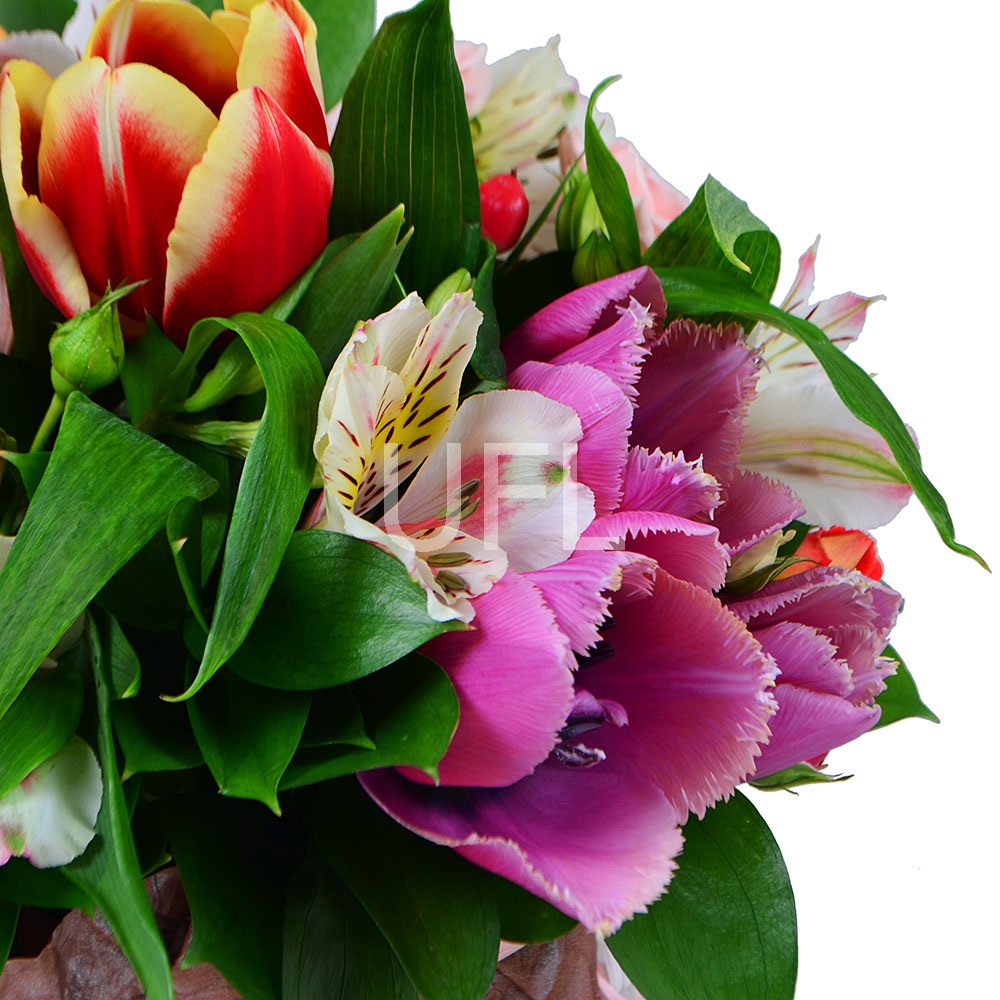 • Consist: Oasis · Packing for a flower bouquet · Tape for flowers · Greens · Tulip violet (5 pc) · Alstroemeria varicolored (2 pc) · Roses spray pink (3 pc) · Rose pink up to 60 sm (5 pc)