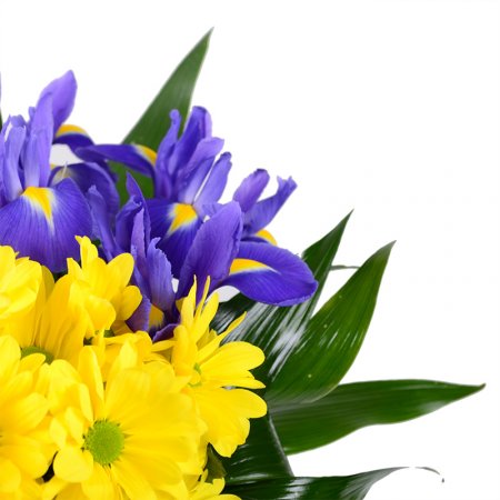 • Consist: Greens (2 pc) · Tape for flowers · Iris blue (9 pc) · Chrysanthemum daisy yellow (3 pc)