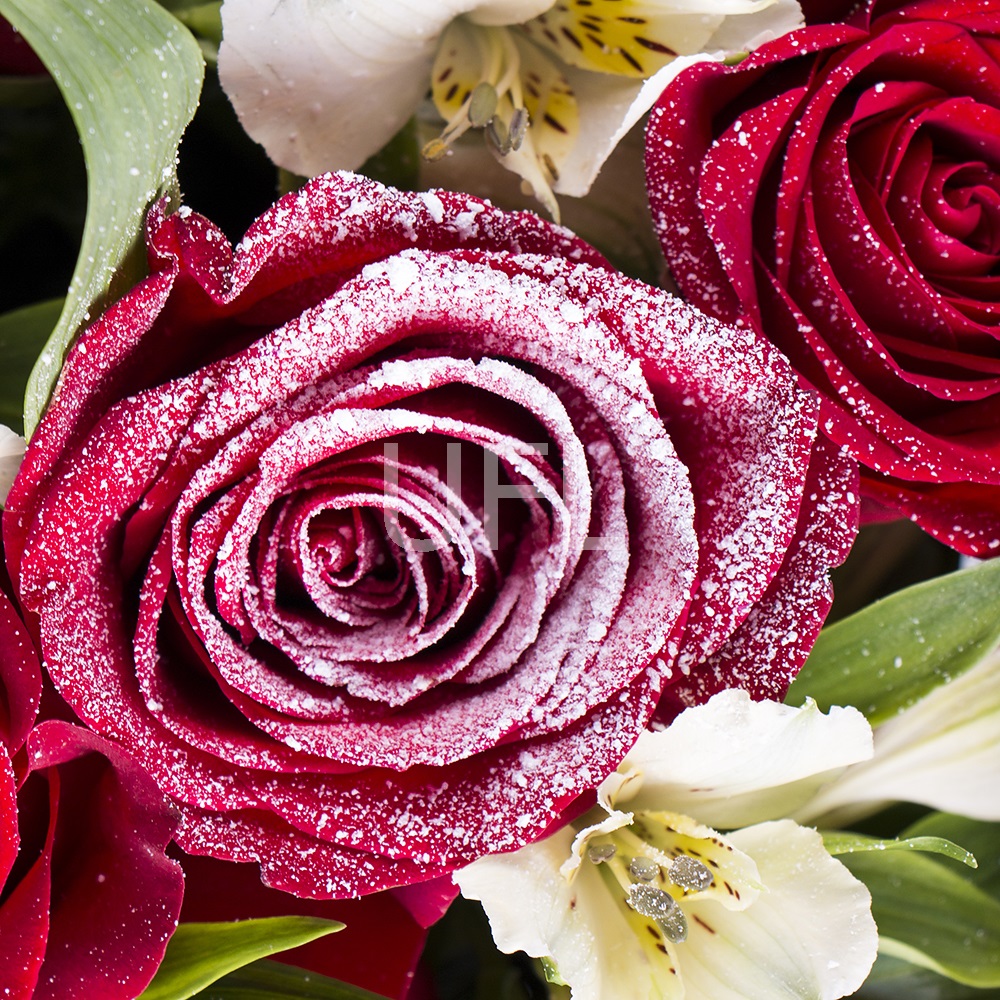 • Consist: Rose red up to 50 cm (21 pc) · Cones (5 pc) · Ornamental flowerpot S · Alstroemeria white (2 pc) · Spruce · Decorative elements · Oasis