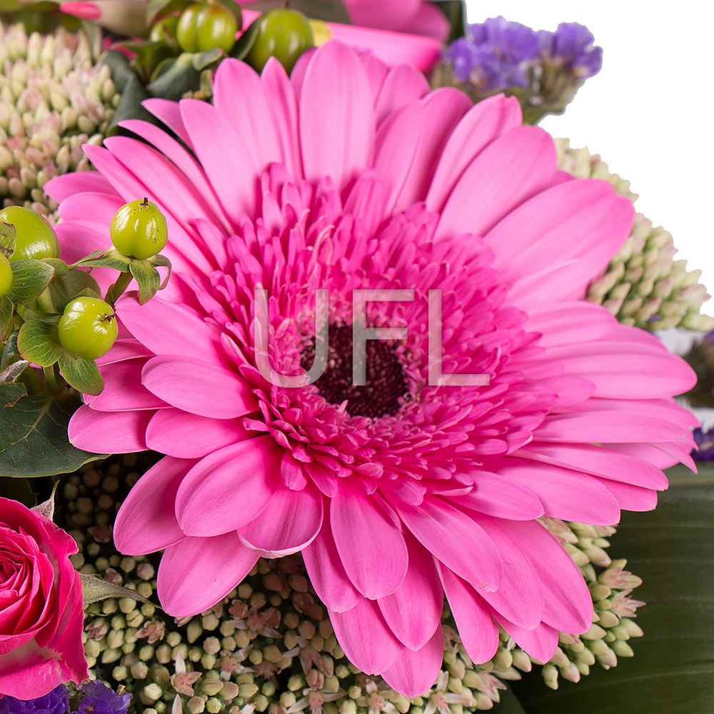 • Consist: Gerbera pink (3 pc) · Hypericum green · Roses spray pink (2 pc) · Statice blue · Packing for a flower bouquet · Tape for flowers · Sedum (4 pc) · Pencil (4 pc)