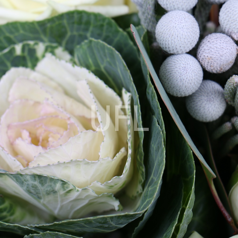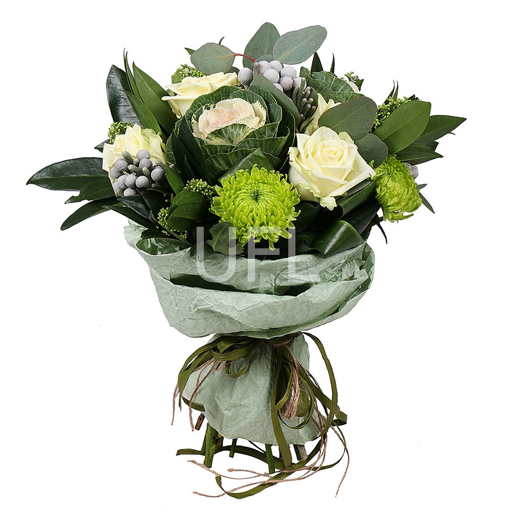 • Consist: Roses white local up to 60cm (5 pc) · Chrysanthemum green single-head (3 pc) · Brunia (3 pc) · Greens · Eucalyptus · Packing for a flower bouquet · Tape for flowers · Skimmia (3 pc) · Brassica white (2 pc)