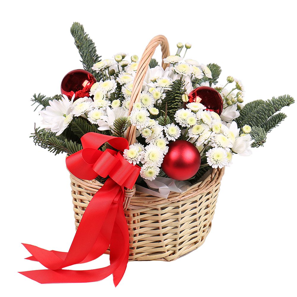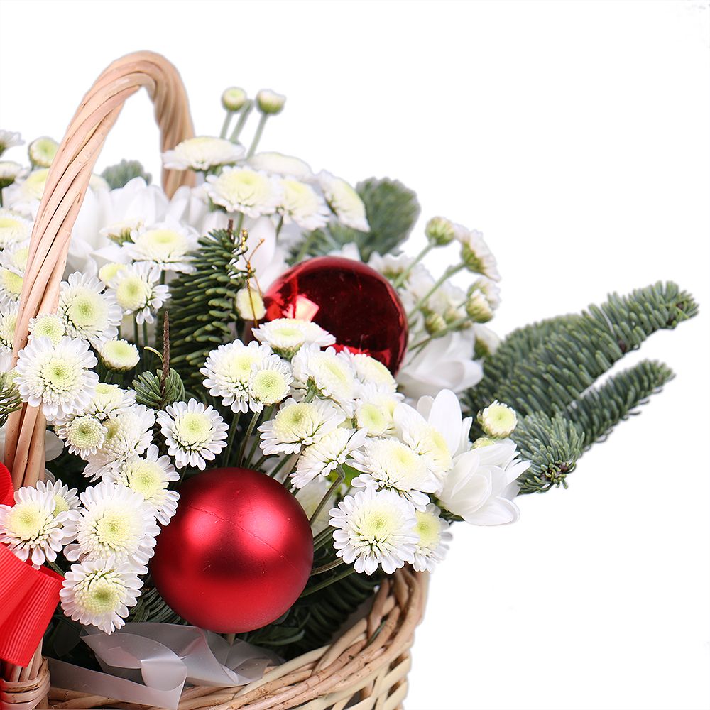 • Consist: Chrysanthemum daisy white (3 pc) · Сhrysanthemum stalion white (2 pc) · Spruce · Christmas balls (3 pc) · Oasis · Basket S · Bow · Tape for flowers