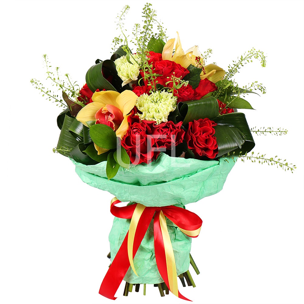 • Consist: Packing for a flower bouquet · Tape for flowers · Greens · Rose red up to 50 cm (13 pc) · tlaspi · Carnation green (3 pc) · Yellow orchid (3 pc)