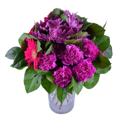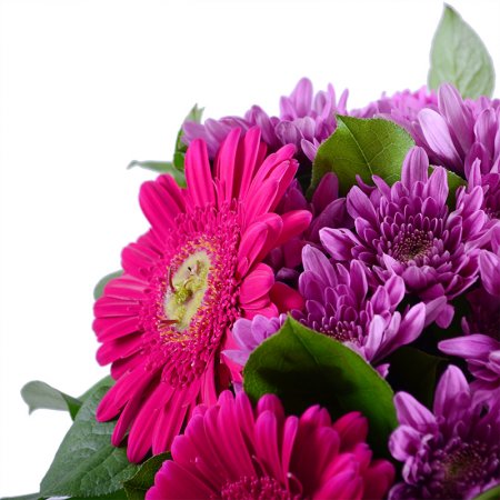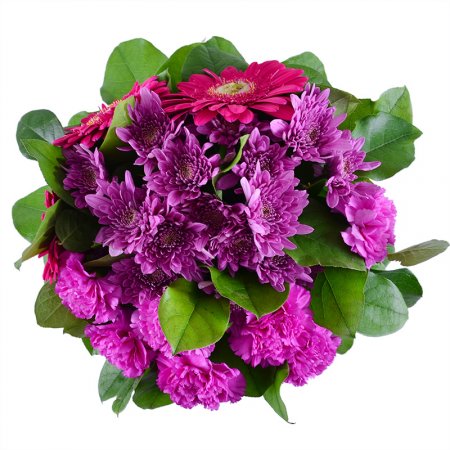 • Consist: Gerbera pink (2 pc) · Carnation pink (6 pc) · Сhrysanthemum pink (3 pc) · Greens · Packing for a flower bouquet · Tape for flowers