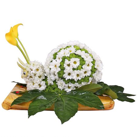 • Consist: Calla yellow (2 pc) · Decorative elements (3 pc) · Greens · Oasis (4 pc) · Chrysanthemum spray green (15 pc) · Chrysanthemum spray white (25 pc)