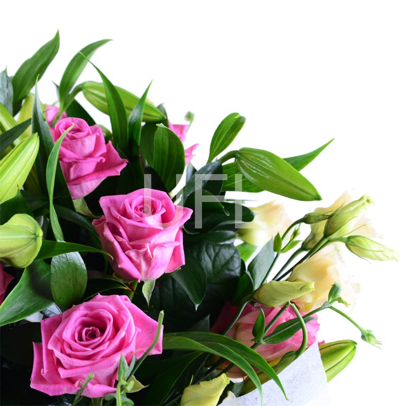 • Consist: Lily white (6 pc) · Rose pink up to 60 sm (9 pc) · Eustoma white (5 pc) · Eustoma pink (5 pc) · Packing for a flower bouquet · Tape for flowers