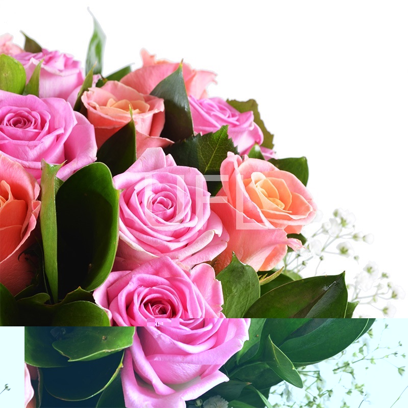 • Consist: Rose pink up to 60 sm (7 pc) · Rose coral under 60 cm (8 pc) · Greens · Gypsophila white (5 pc) · Packing for a flower bouquet · Tape for flowers