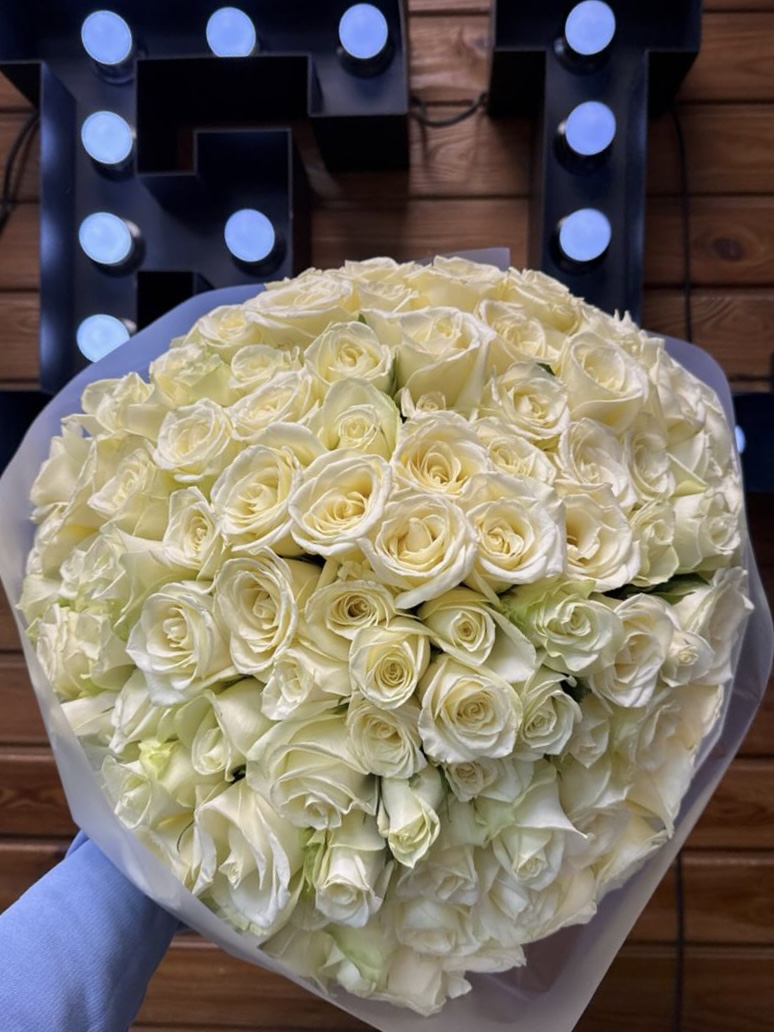 Order 101 white roses Kenia in Lozovaya — it means giving emotions and a good mood. This bouquet is often chosen for a loved one.