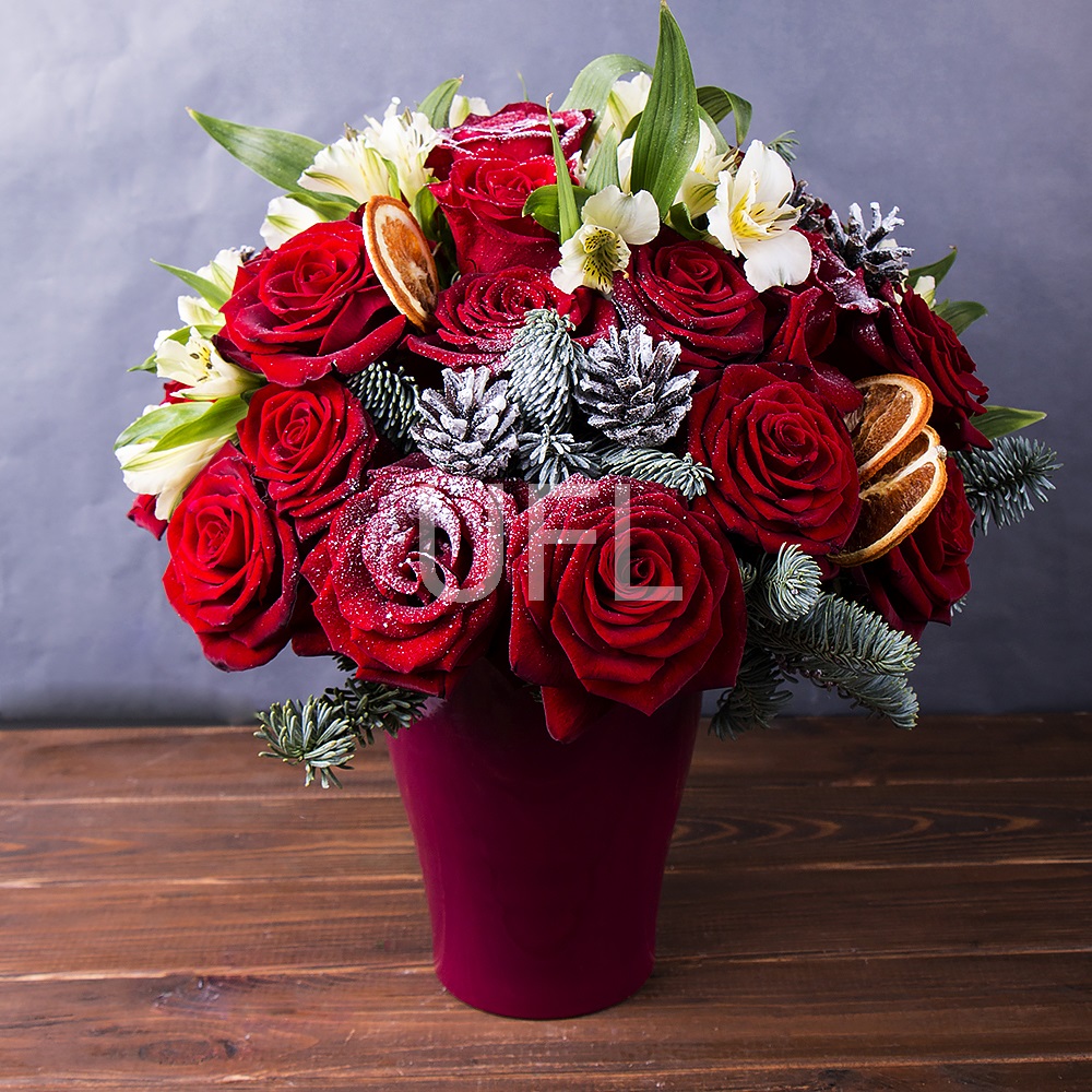 • Consist: Rose red up to 50 cm (21 pc) · Cones (5 pc) · Ornamental flowerpot S · Alstroemeria white (2 pc) · Spruce · Decorative elements · Oasis