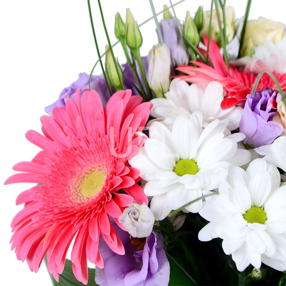 • Consist: Gerbera pink (3 pc) · Rose spray cream (2 pc) · Eustoma violet · Beargrass · Toy Teddy bear 5-10 cm (3 pc) · Butterflies decorative · Greens · Chrysanthemum spray white