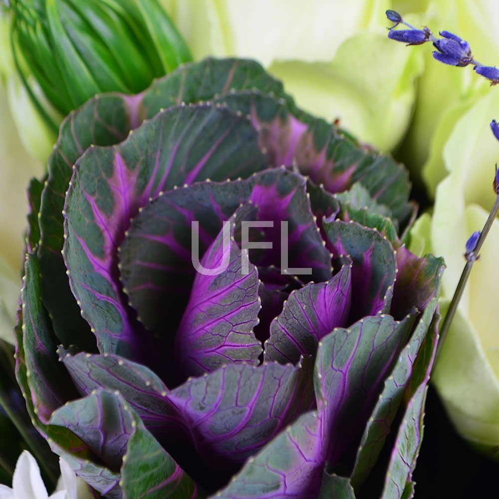 • Consist: Roses white local up to 60cm (9 pc) · Lavender · Brunia (2 pc) · Freesia white (5 pc) · Ornithogalum (4 pc) · Packing for a flower bouquet · Tape for flowers · Brassica purple (2 pc)