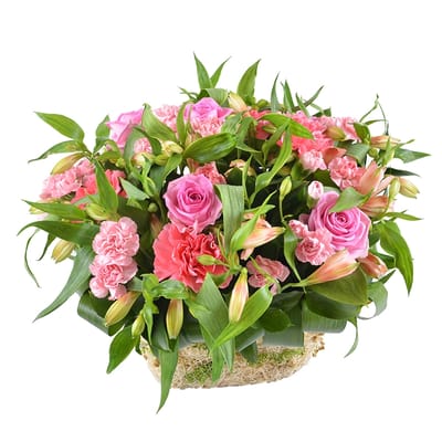 • Consist: Box M · Oasis · Rose pink up to 60 sm (5 pc) · Alstroemeria pink (8 pc) · Carnation pink (8 pc) · Greens