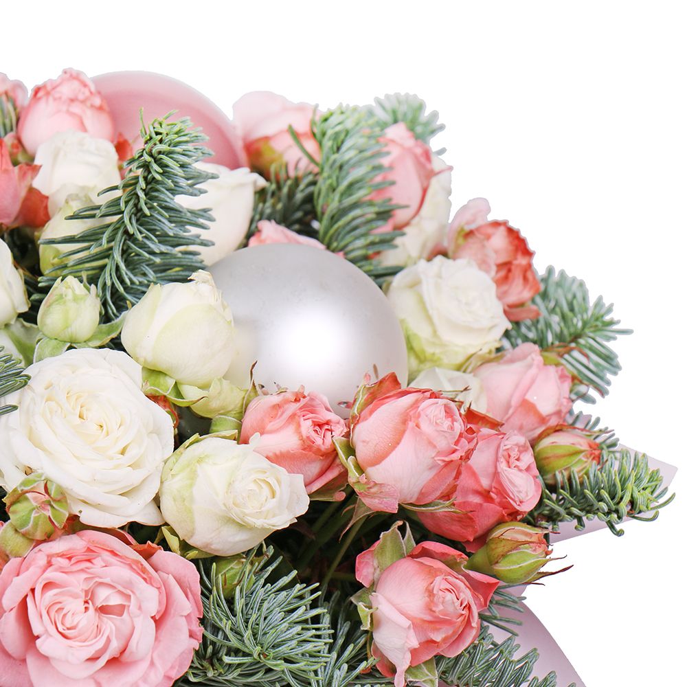 • Consist: Rose shrub white (4 pc) · Round box S 13x14 cm · Oasis · Christmas balls (3 pc) · Pink spray rose (3 pc) · Spruce branch