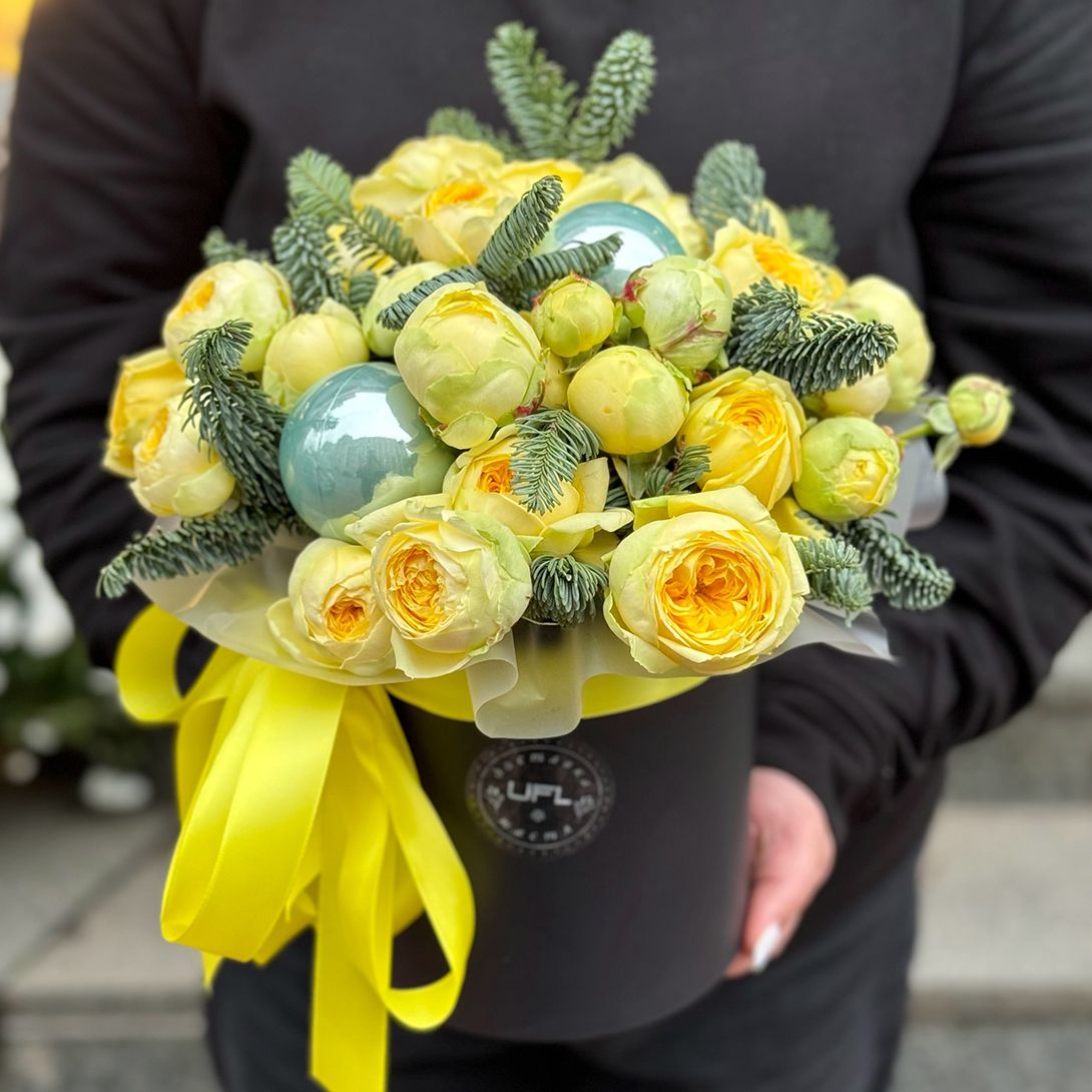 • Consist: Rose yellow spray (11 pc) · Christmas balls (3 pc) · Box round L · Tape for flowers · Oasis · Spruce branch 1/2