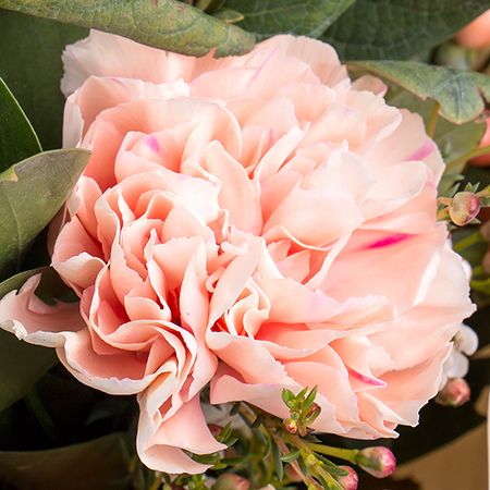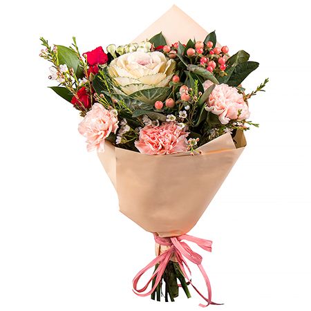 • Consist: Carnation light pink (3 pc) · Hypericum pink (2 pc) · Rose spray red (2 pc) · Packing for a flower bouquet · Bouvardia · Tape for flowers · Greens · hamelatsium · Brassica white