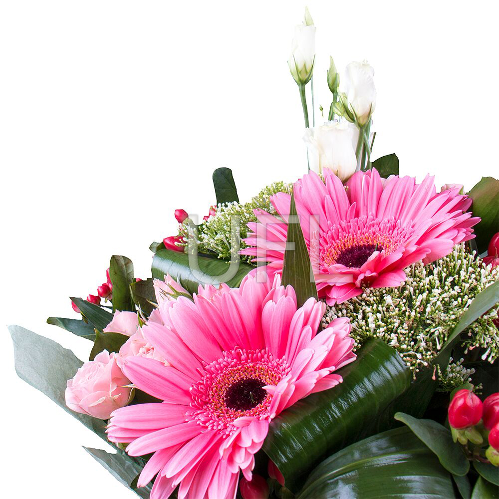 • Consist: Gerbera pink (3 pc) · Hypericum red (2 pc) · Roses spray pink (4 pc) · Eustoma white · Trahelium green (3 pc) · Greens · Packing for a flower bouquet · Tape for flowers