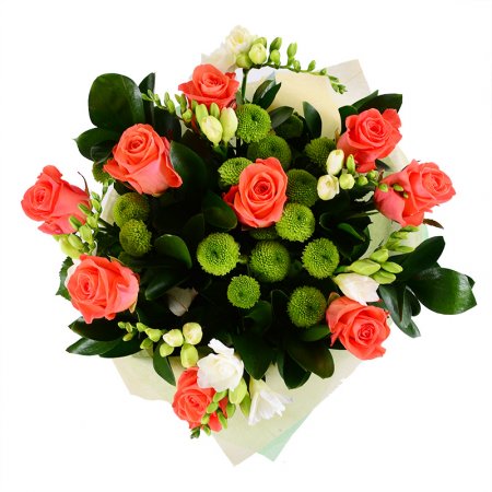 • Consist: Rose orange (9 pc) · Freesia white (5 pc) · Сhrysanthemum green (3 pc) · Packing for a flower bouquet · Ruskus (5 pc) · Tape for flowers
