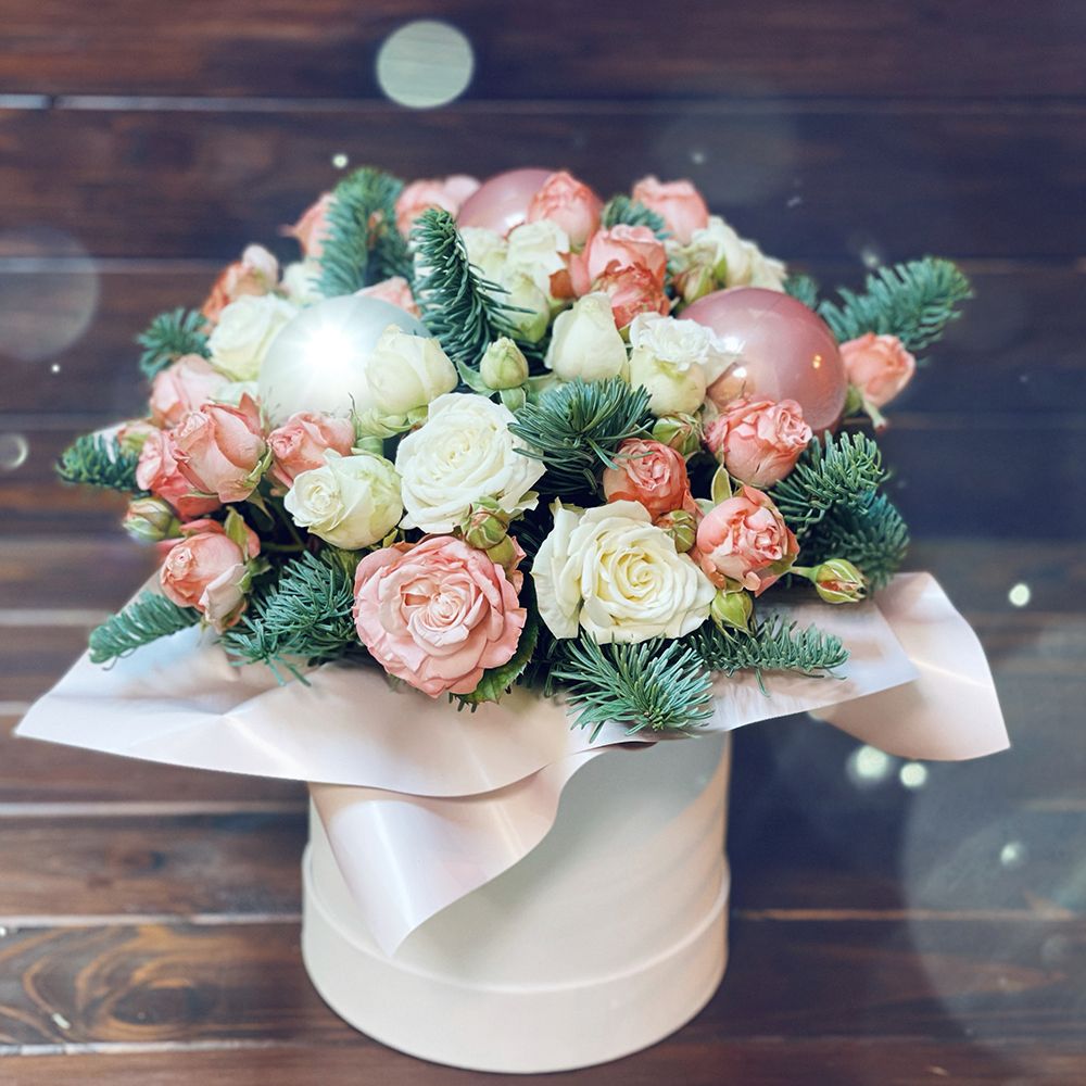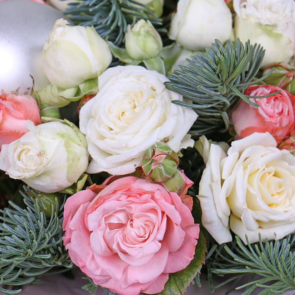 • Consist: Rose shrub white (4 pc) · Round box S 13x14 cm · Oasis · Christmas balls (3 pc) · Pink spray rose (3 pc) · Spruce branch