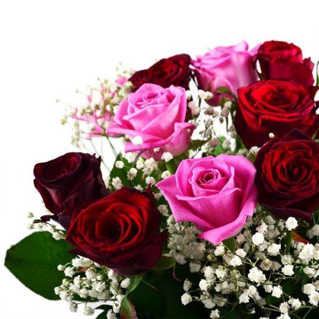 • Consist: Rose pink up to 60 sm (6 pc) · Gypsophila white (3 pc) · Greens · Tape for flowers · Roses red up to 50 cm (7 pc)