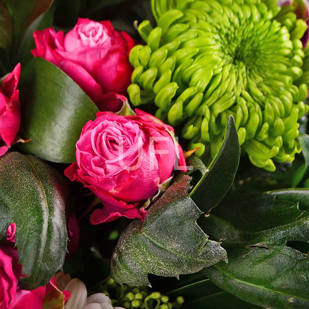 • Consist: Roses spray pink (3 pc) · Chrysanthemum green single-head (3 pc) · Alstroemeria varicolored (3 pc) · Gerberа white (3 pc) · Tape for flowers · Toy Teddy bear 5-10 cm (3 pc) · Bouvardia (2 pc) · Skimmia (2 pc)