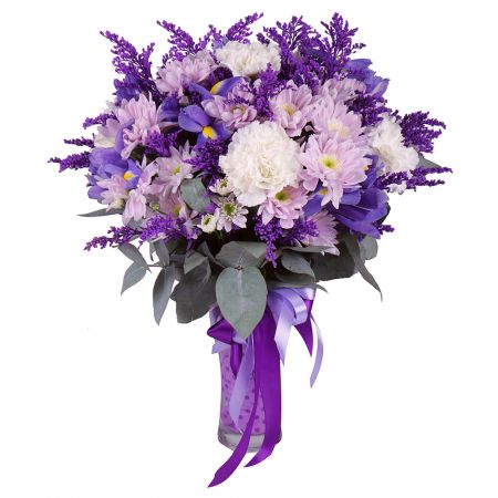 • Consist: Carnation white (5 pc) · Iris blue (7 pc) · Solidago (4 pc) · Сhrysanthemum pink (3 pc) · Eucalyptus (2 pc) · Packing for a flower bouquet · Tape for flowers