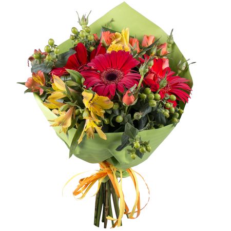 • Consist: Hypericum green (3 pc) · Rose shrub orange (2 pc) · Packing for a flower bouquet · Tape for flowers · Alstroemeria varicolored (3 pc) · Gerberа varicolored (3 pc)